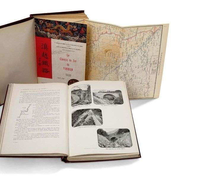Ouvrage en 2 volumes in folio. - T. 1, Texte, 202 p. avec nombreuses illustrations en noir et blanc. - T. 2, Planches de croquis et cartes, numérotées 1 à 55, avec 7 planches en bis, la plupart à double page ou dépliantes. Edité par La Compagnie Française des Chemins de Fer de l'Indo-Chine et du Yunnan, Société de construction de Chemins de Fer Indo-Chinois, Paris, Imprimerie G. Goury, avril 1910. Reliure ancienne cartonnée et toilée de rouge foncé, couvertures illustrées conservées.