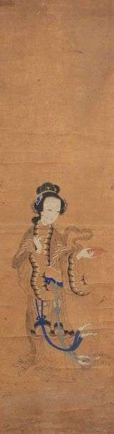 Peinture verticale à l'encre et couleurs sur papier représentant la déesse de l'automne écrivant un poème d'amour.