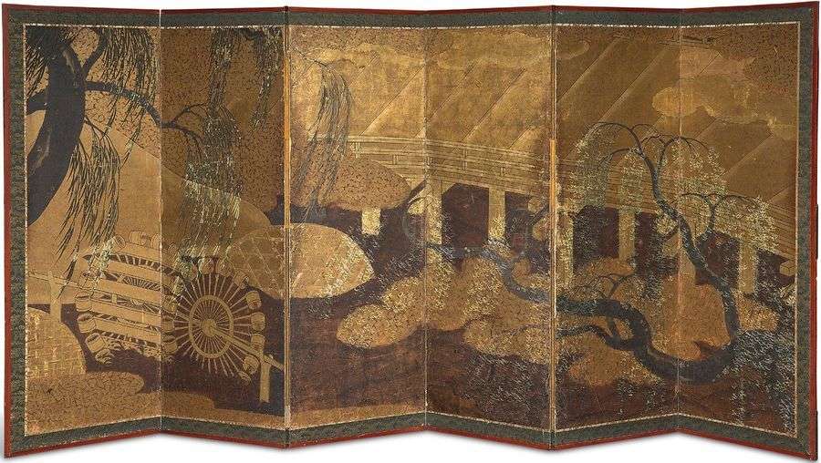 Paravent Byobu à six feuilles, en polychromie à dominante or et bronze, figurant un grand pont parmi des saules pleureurs, une roue à aubes apparaissant sur le côté.