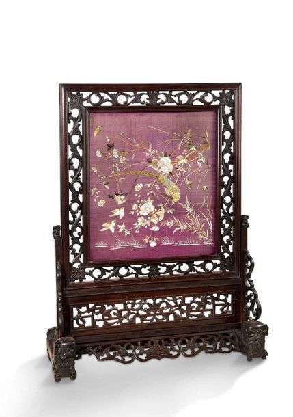 Grand panneau carré en soie parme brodée en polychromie pastelle jaune, doré et vert, d'un faisan, entouré d'oiseaux et papillons parmi fleurs et feuillages| dans un large cadre et avec socle en bois foncé sculptés et ajourés de rinceaux. Encadrement en bois de rose, sculpté.