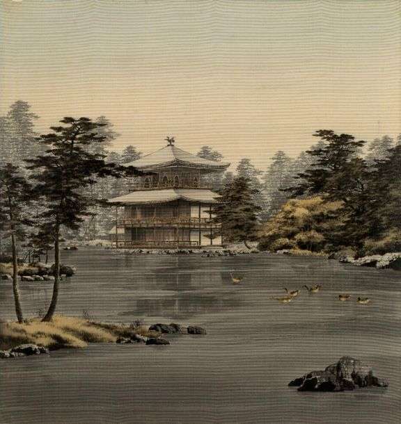 Paire de tableaux, impressions en camaïeu de blanc, gris et noir sur soie, l'une représentant le Kinkaku-ji de Kyoto, l'autre une vue du Mont-Fuji à partir d'un cours d'eau animé d'embarcations.