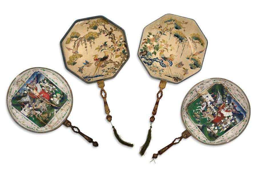 Lot de deux paires d'éventails plats, l'une avec écran octogonal, en soie à décor brodé apparaissant sur les deux faces, d'oiseaux, papillons, pin et fleurs| l'autre à écran circulaire, une face à décor peint d'une chasse au tigre, l'autre face brodée d'une scène dans un jardin, les visages en ivoire. Les manches en bois laqué noir et or ornés de personnages.