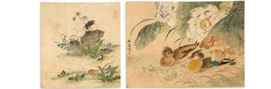 Trois petites peintures sur soie marouflées sur carton, représentant hirondelle et glycines, signée Shôtaku| couple de canards mandarins, signée Sekinô shasei| insectes et lézards parmi fleurs et rochers, signée avec cachet.