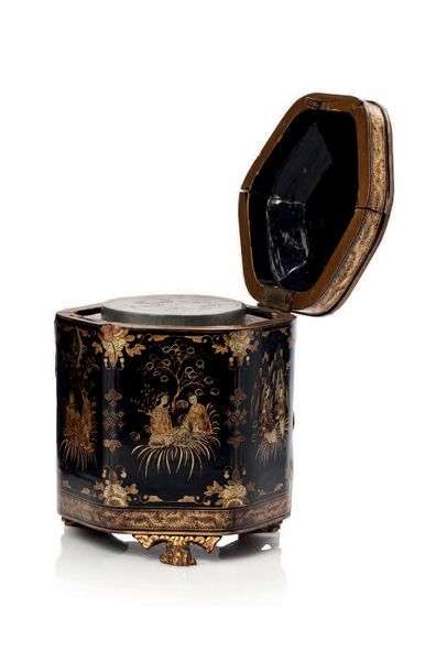 Boîte circulaire couverte en laque de cinabre sur âme en métal, sculptée de deux joueurs de go, assis sous un saule pleureur près d'un pavillon, accompagnés de trois jeunes disciples.