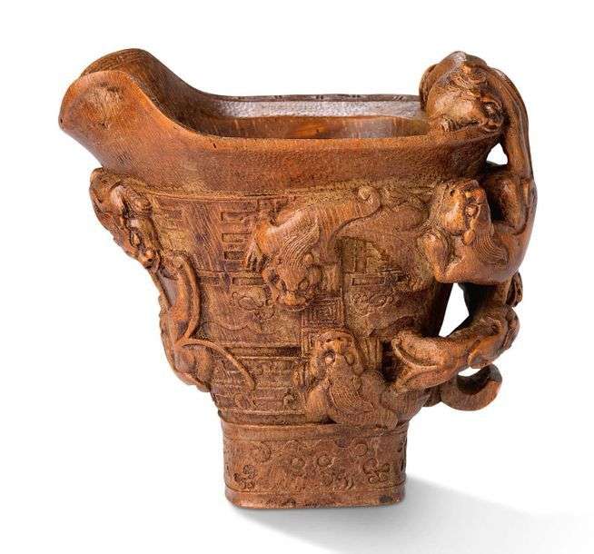 Coupe libatoire en bambou sculptée de cinq lions sur le pourtour et quatre autres lions grimpant sur l'anse et le bord de la coupe, grecques et motifs floraux complètent le décor.
