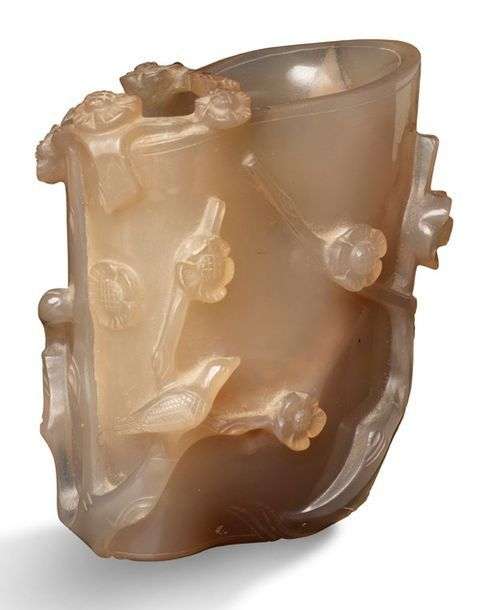 Petit godet de peintre en agate sculpté en relief de branches fleuries.