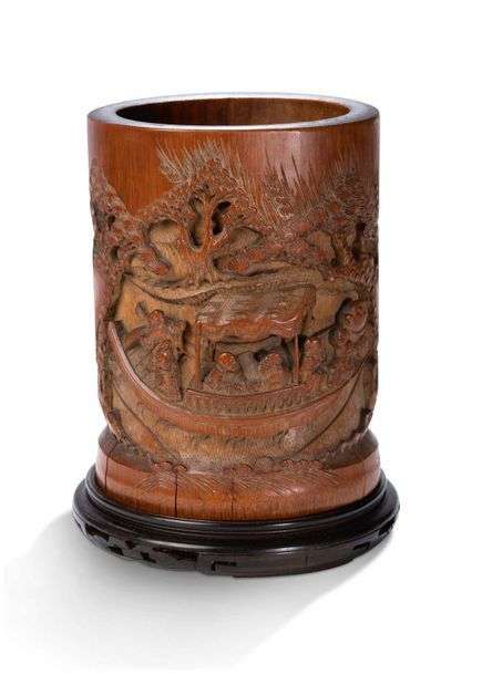 Porte-pinceaux en bambou, sculpté en haut relief d'un bateau transportant un groupe de personnages dans une forêt de pins.
