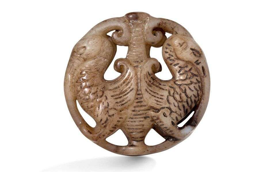Pendentif en stéatite gris céladonné, représentant deux oiseaux mythiques dos à dos. ~