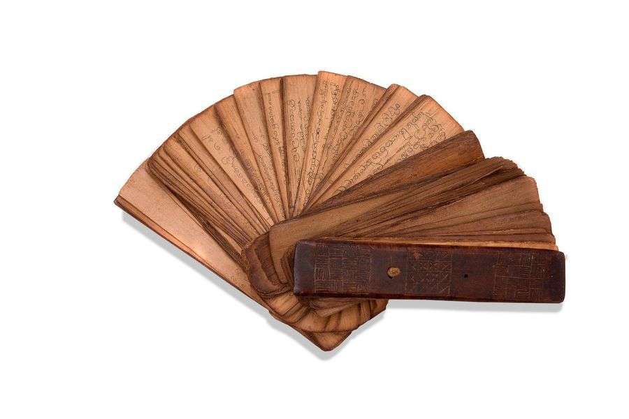 Manuscrit bouddhique sur feuilles de latanier. Les couvertures en bois, ornées de motifs géométriques.~