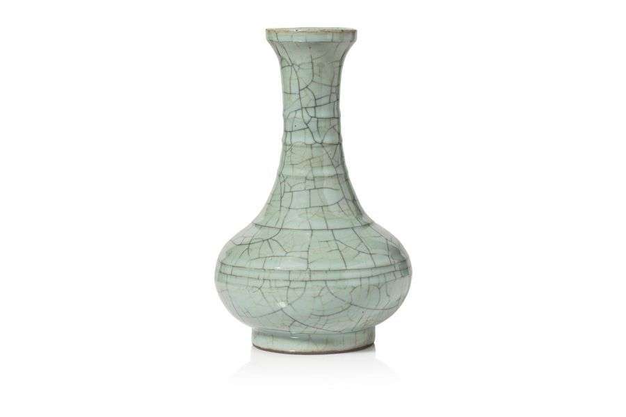 Vase à large panse et haut col annelé en porcelaine émaillée céladon craquelée, les craquelures rehaussées de brun.~