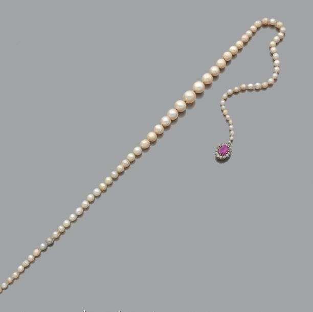 Chute de 79 perles fines et de 3 perles de culture. Fermoir rubis, diamants.