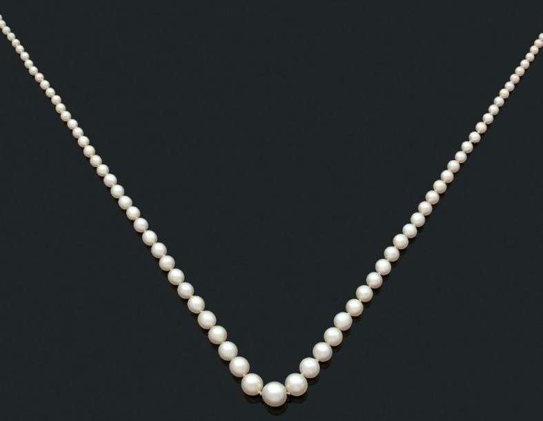 COLLIER «PERLES FINES» Composé d'une chute de 86 perles fines et 1 perle de culture. Fermoir diamants, or 18K (750). Pb.: 18.1gr. Accompagné d'un certificat LFG N° 372531 précisant: Perles fines - eau de mer et précisant la position de la perle de culture. Diam.: 3.1 x 9.2 mm