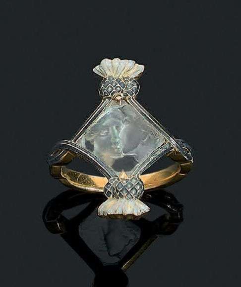 BAGUE « LE BAISER ». Deux profils s'embrassant, l'un en relief, l'autre en intaille. Verre pressé, décor de chardons émaillés et or 18K (750). Signée, vers 1900-1905. Pb.: 6.35 gr - Td.: 51