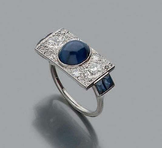 Saphir cabochon, diamants de taille ancienne et huit-huit, saphirs calibrés, platine (850).