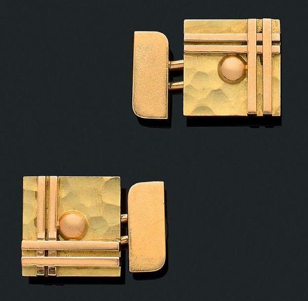 Paire de boutons de manchette carrés «formes géométriques», or jaune martelé 18K (750).