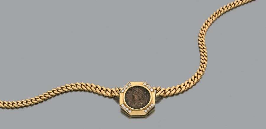 Collier pièce «Roman Empire Constantinus II», diamants et or 18K (750).
