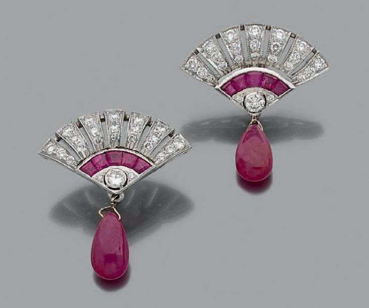 PAIRE DE CLIPS D'OREILLES Diamants et rubis, or gris 18K (750).