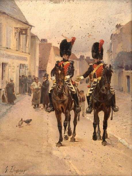 Scène équestre figurant deux gendarmes d’élite, époque Restauration, traversant