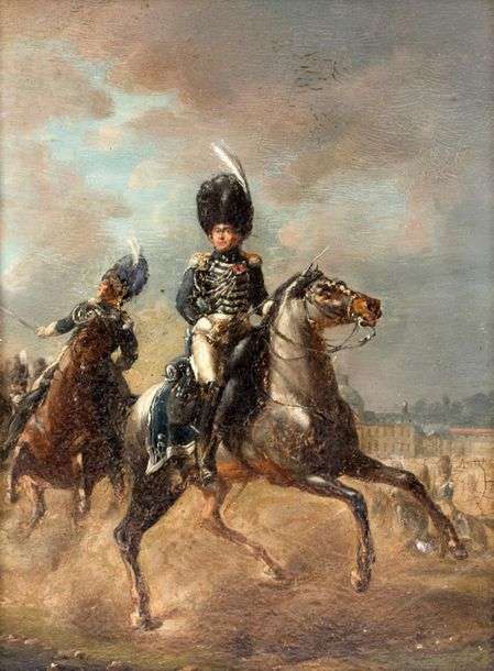en tenue de Général des grenadiers à cheval de la Garde Royale, défilant devant l’école militaire