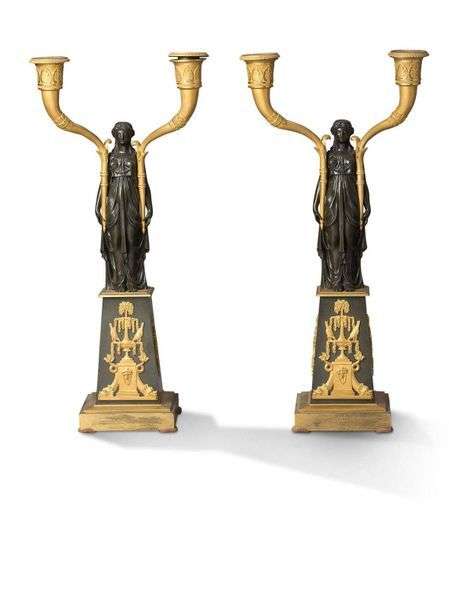 PAIRE DE CANDÉLABRES AUX VESTALES à deux bras de lumières. Le fût en bronze patiné en forme d'obélisque reçoit un décor appliqué de volatiles s'abreuvant sur une fontaine accostée par deux dauphins. La monture est formée de deux vestales supportant deux cornes d'abondance ornée de frise de palmettes. Epoque Empire
