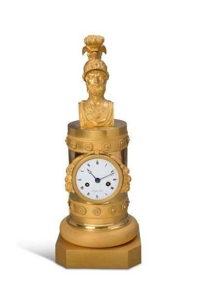 PENDULE BORNE en bronze ciselé et doré. La base, de forme cylindrique est ornée d'un décor appliqué de fleurons et frises d'oves. Elle est surmontée d'un buste de Mars revêtu d'une cuirasse et d'un casque empanaché à décor d'une tête de Minerve et d'un dragon ailé. Cadran émaillé blanc présentant les heures en chiffres arabes, signé LAFOLLIE à Paris. Epoque Empire