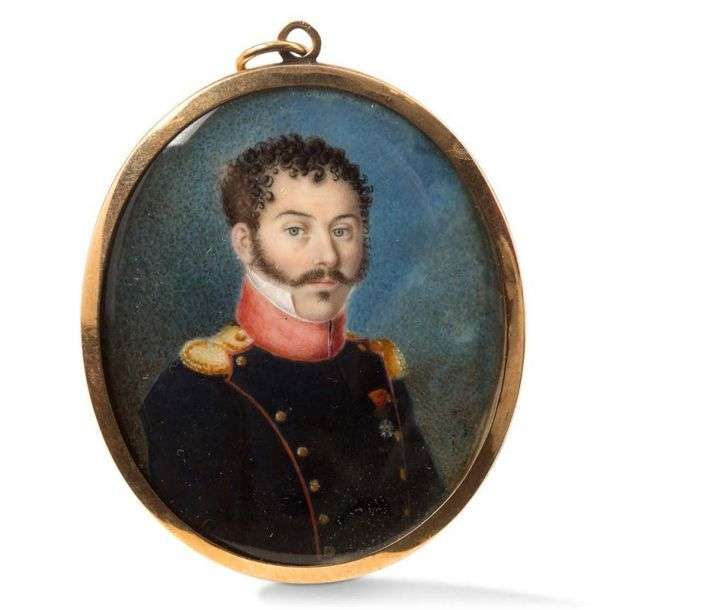 Portrait miniature sur ivoire ovale double face d'un officier d'artillerie décoré de la légion d'honneur, de l'autre face, une femme de qualité en robe. Ils sont présentés dans un cadre type médaillon en or. 5,2 cm hors cadre