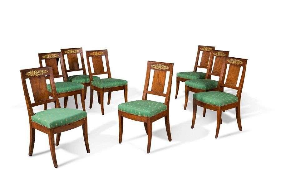 Ensemble de huit chaises à dossier bandeau en noyer et ornementation de bronze d'applique à décor d 'un trophé militaire dans un entourage de roses.
