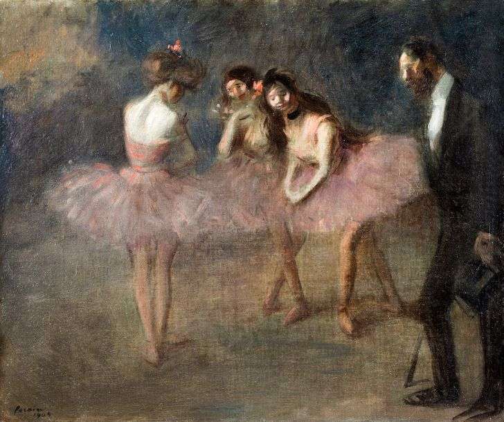 Cette œuvre représente parfaitement le talent de Forain pour croquer les habitudes des danseuses et des abonnés. Ici, loin des lumières de la scène, les jeunes danseuses aux silhouettes sveltes et gracieuses saluent, en tenue, un homme au pardessus noir et au haut de forme. Le contraste entre la blancheur des chairs des jeunes femmes, le rose tendre de leurs tenues et la dureté de leurs visages, l’environnement sombre de la scène ainsi que le costume strict de l’homme rend l’apparition de ce dernier encore plus troublante. Anonymes, sorties de scène, ces danseuses s’élèvent au rang de symbole de la vie mondaine et artistique du Paris de la fin du siècle, et ainsi de topos de la peinture impressionniste. Le travail et la technique rapide de l’artiste ainsi que les aplats de couleurs rendent parfaitement les sensations et la torsion des corps.