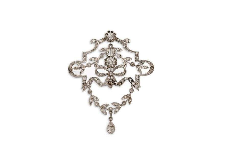 Broche-pendentif guirlande sertie de diamants de taille ancienne et taillés en rose, or gris 18K (750).