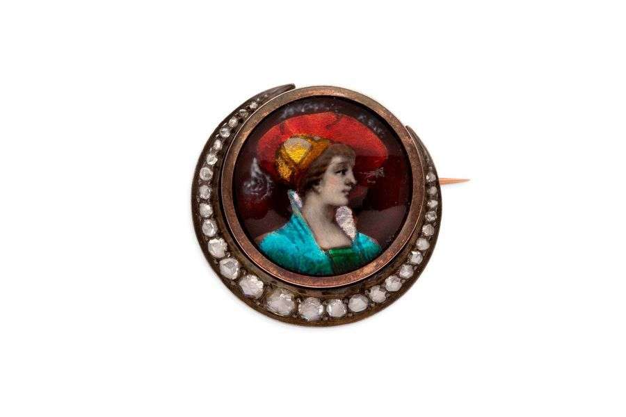 Email de Limoges, diamants taillés en rose à facettés en forme de croissant de lune, argent(<800) et or 18K (750). Signé E.Blancher.