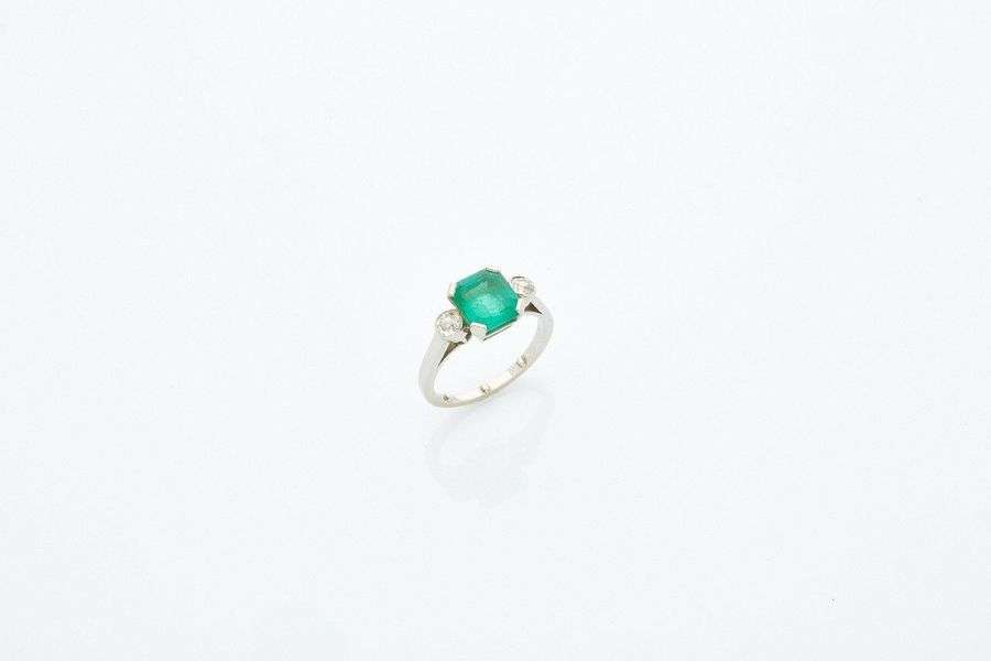 Bague émeraude, épaulé de deux diamants, platine (850).