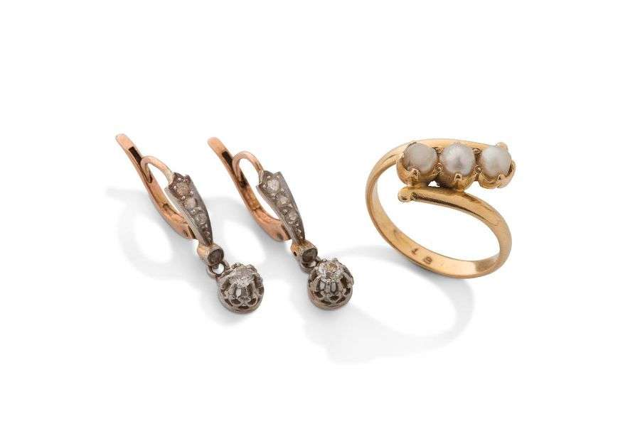 Lot composé d'une bague sertie de perles et d'une paire de boucles d'oreilles sertie de taille ancienne et taillés en rose, or 18K (750).