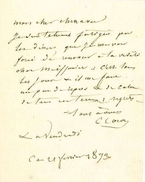 L.A.S. «C. Corot», 21 février 1873, à Paul CHENAVARD| 1 page in-12.