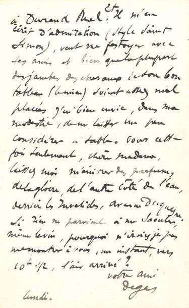 L.A.S. «Degas», Lundi [janvier 1883, à Mme Albert BARTHOLOMÉ]| 2 pages in-8.