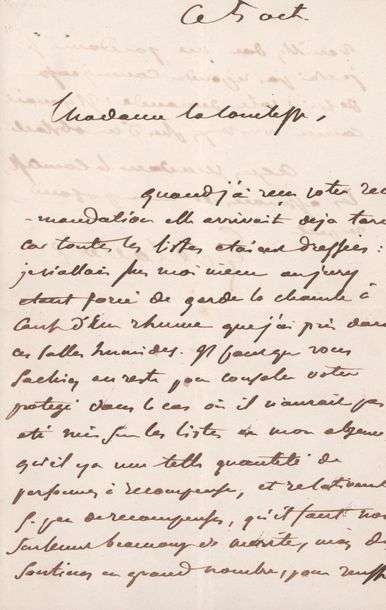 L.A.S. à la comtesse ****. S.l., 5 octobre. 1 p. ½ in-8.