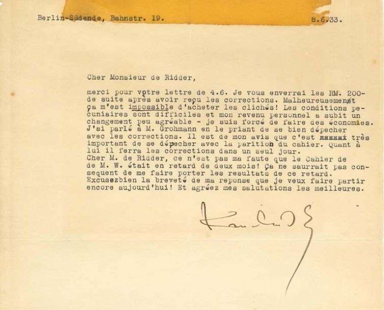 L.S. «Kandinsky», Berlin-Südende 8 juin 1933, à André de RIDDER| demi-page in-4 dactylographiée (marque d'adhésif sur le bord supérieur)| en français.