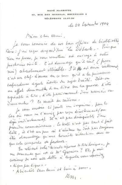 L.A.S. «RM», Bruxelles 24 septembre 1964, à son ami André BOSMANS| 1 page in8 à son en-tête.