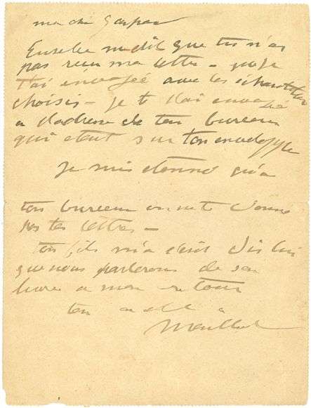 «Eusèbe me dit que tu n'as pas reçu ma lettre - que je t'ai envoyée avec les échantillons choisis. Je te l'ai envoyée à l'adresse de ton bureau qui était sur ton enveloppe. Je suis étonné qu'à ton bureau on ne te donne pas tes lettres. Ton fils m'a écrit dis-lui que nous parlerons de son livre à mon retour»...