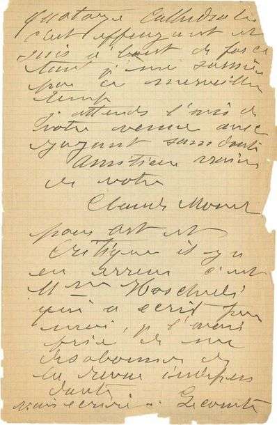 L.A.S. «Claude Monet», Hôtel d'Angleterre, Rouen «3 ou 4 avril ou peutêtre 5» [1893 ?], à un ami| 2 pages in-8 sur papier quadrillé (fentes et bords effrangés avec quelques petits manques marginaux de papier).