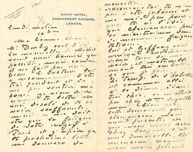 L.A.S. «Claude», Londres lundi matin [26 février 1900], à SA FEMME| 8 pages in-8, en-tête Savoy Hotel (quelques marques marginales au stylo rouge).