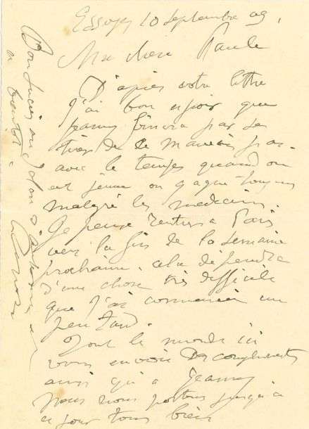 Il pense rentrer à Paris en fin de semaine prochaine, mais «cela dépendra d'une chose très difficile que j'ai commencée un peu tard»... Il lui souhaite: «Bon succès au Salon d'Automne», et il ajoute quelques mots à l'intention de la malade: «Ma chère Jeannie, Encore un peu de courage et tout ira bien. Nous en avons tous espoir»...