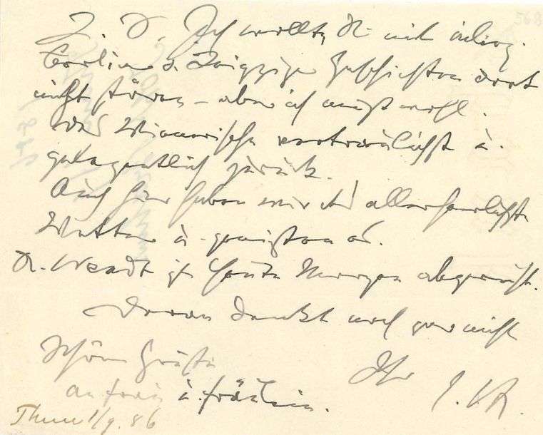 L.A.S. «J. Br.», [Thun 1er septembre 1886, à son éditeur Fritz SIMROCK| 1 page oblong in-12| en allemand.