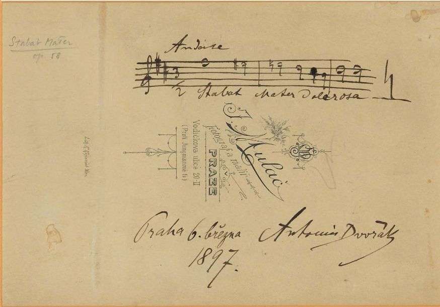 Au dos de sa photographie (par J. Mula? à Prague), Dvo?ák a inscrit les trois premières mesures de son Stabat Mater, chant et paroles, avec l’indication Andante : « Stabat Mater dolorosa »… Au-dessous, la date en tchèque et la signature : « Praha 6 br?zna 1897. Anton?n Dvo?ák ».