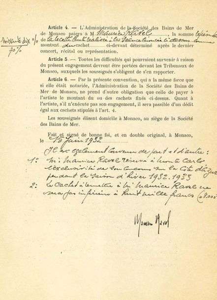 «Mr Maurice Ravel, artiste compositeur et chef d'orchestre [...] s'engage à prêter son concours à un concert qui aura lieu le mercredi 12 avril 1933»... M. Ravel s'engage à soumettre à la Société des Bains de Mer au moins deux projets de programme, et de ne coopérer à aucun autre spectacle «dans les Alpes-Maritimes et la Principauté de Monaco», avant d'avoir donné le concert qui fait l'objet du présent engagement.