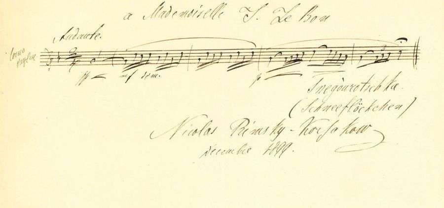5 mesures pour cor anglais («corno inglese») de son opéra «Snegòurotschka (Schneeflöckchen)» (La Demoiselle des neiges), avec l'indication «Andante», et dédicace «à Mademoiselle J. Le Bon».