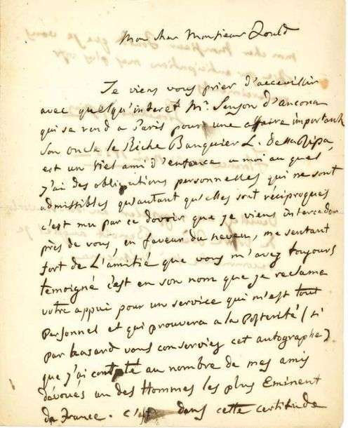 Il recommande à Fould M. Sanson d'Ancona «qui se rend à Paris pour une affaire importante. Son oncle le Riche Banquier L.