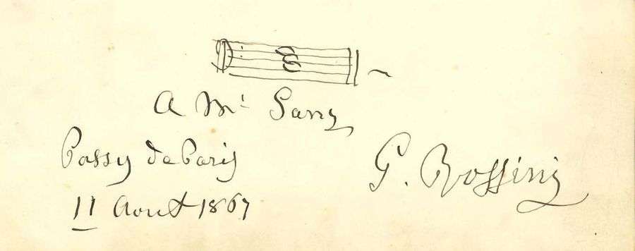 Music à Londres. Ses Memoirs of a musicien reproduisent ce document, qui fut découpé de l'album d'autographes de Ganz, signé par Rossini à la requête de son admirateur, lorsque celui-ci lui rendit visite à Passy. Selon