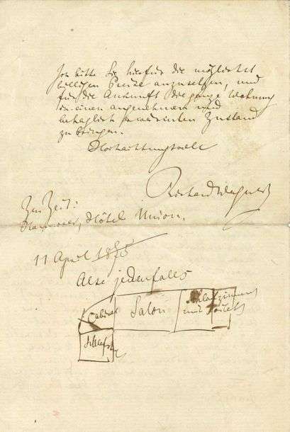 Thiergarten-Hôtel le 15 avril pour y rester au moins jusqu'au 26. Il aimerait avoir l'appartement du 1er étage, avec le cabinet d'angle après la Leipziger Thor à droite| mais il souhaite qu'à part le salon qui lui est attenant, la pièce suivante, si elle est grande, soit meublée comme une chambre et une salle de bain pour sa femme| si elle est petite (ce qu'il ne voudrait pas), alors comme une chambre pour lui. Outre le salon et le cabinet d'angle, il faudrait aussi la grande chambre (avec un lit) attenante à ce dernier. Plus une chambre pour la femme de chambre et une autre pour son valet. Il demande de fixer les tarifs les plus bas possibles, et d'aménager l'ensemble de l'appartement dans un état agréable et confo