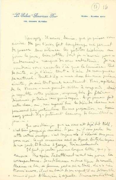 L.A.S. «Louis Aragon», Paris [1923 ?], à Denise LÉVY| 2 pages in-8, en-tête “Le Select”. American Bar.