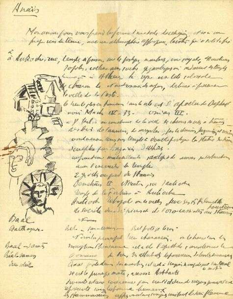 MANUSCRIT autographe avec DESSINS originaux à la plume, Anaïs, [vers 1933]| 1 page et demie in-4 (déchiré en deux et recollé au papier gommé).